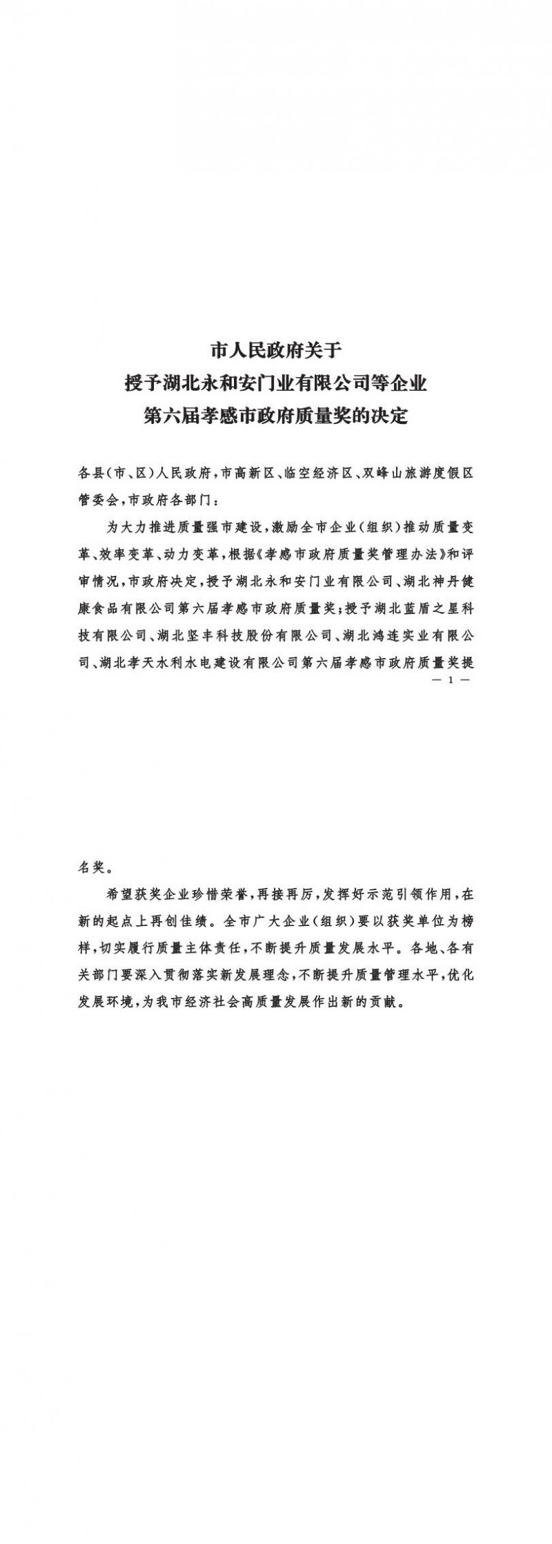 市人民政府關(guān)于授予湖北永和安門(mén)業(yè)有限公司等企業(yè)第六屆孝感市政府質(zhì)量獎(jiǎng)的決定