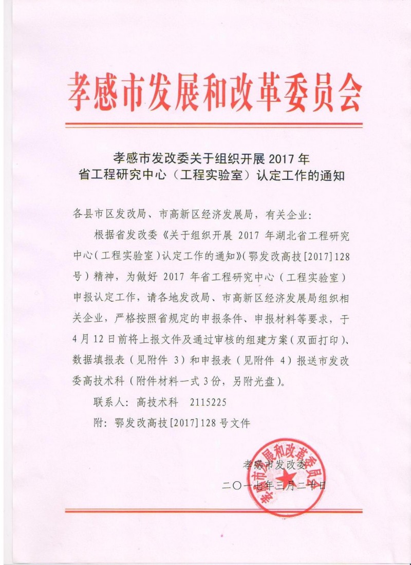 孝感市發(fā)改委關(guān)于組織開展2017年省工程研究中心(工程實驗室)認(rèn)定工作的通知