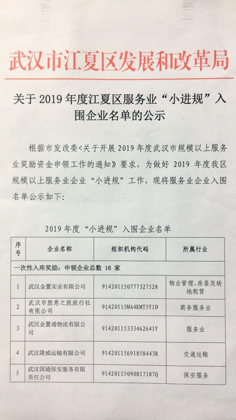 關于2019年度江夏區(qū)服務業(yè)“小進規(guī)”入圍企業(yè)名單的公式