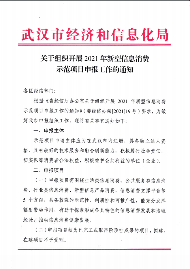 根據(jù)《市經(jīng)信局關(guān)于組織開展2021年新型信息消費(fèi)示范項(xiàng)目申報(bào)工作的通知》要求,為做好我區(qū)申報(bào)組織工作,現(xiàn)將有關(guān)事宜通知如下: