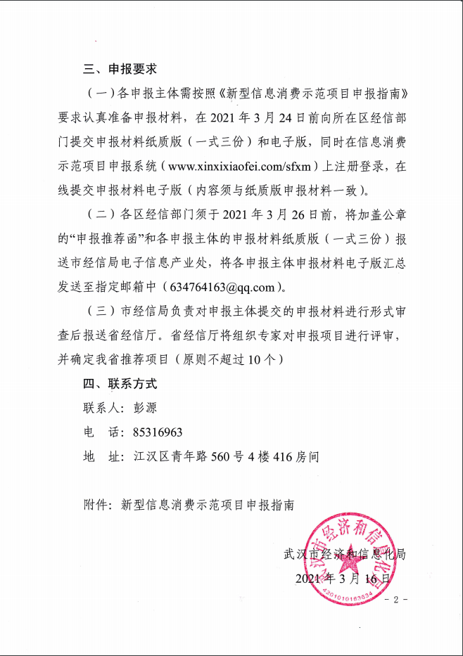 各申報(bào)企業(yè)需按照《新型信息消費(fèi)示范項(xiàng)目申報(bào)指南》要求認(rèn)真準(zhǔn)備申報(bào)材料,在2021年3月23日17:00之前提交申報(bào)材料紙質(zhì)版(一式三份)至東湖高新區(qū)政務(wù)中心7號(hào)樓7016室和word電子版及PDF蓋章版一并打包發(fā)送至郵箱1930171438@qq.com,同時(shí)在信息消費(fèi)示范項(xiàng)目申報(bào)系統(tǒng)(www.xinxixiaofei.com/sfxm)上注冊(cè)登錄,在線提交申報(bào)材料電子版(內(nèi)容須與紙質(zhì)版申報(bào)材料一致)。